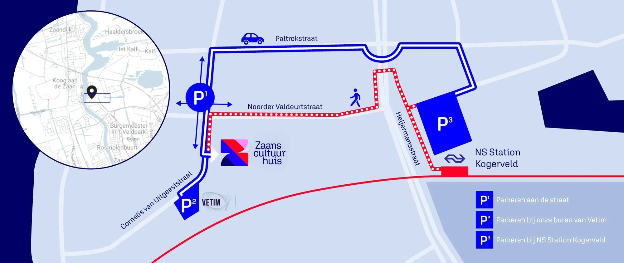 Het Zaans Toneelhuis is goed bereikbaar met de auto, maar ook het openbaar vervoer. Station Kogerveld en Koog a/d Zaan zitten op loopafstand bij ons in de buurt.